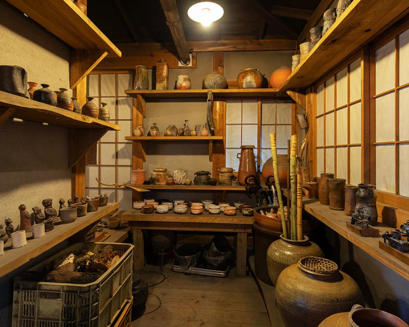 信楽焼の壷が点在する庭を進むと、土間と囲炉裏のある空間が広がります。