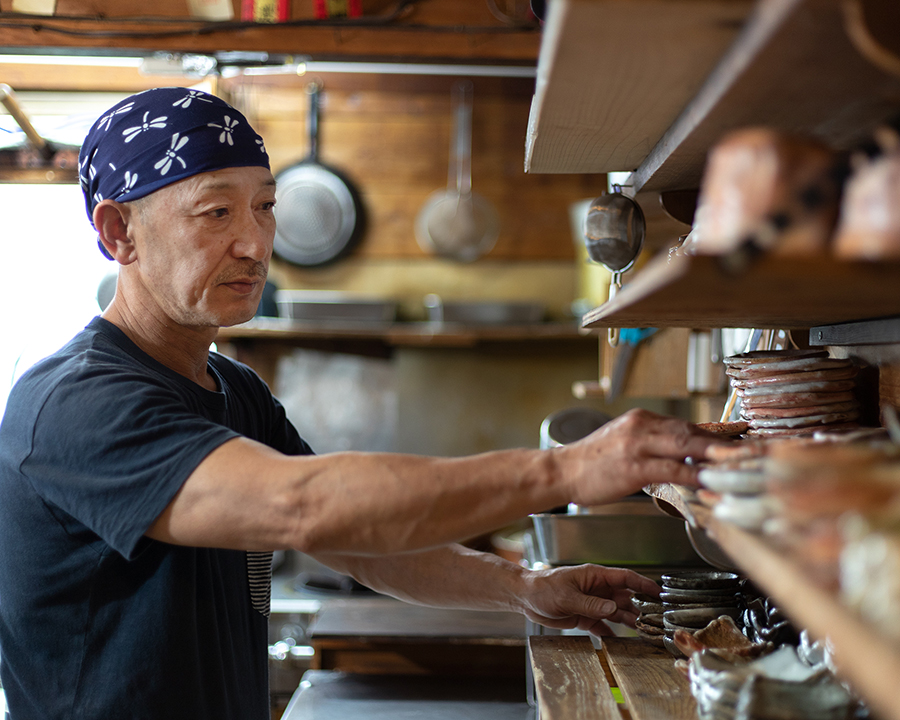 陶芸家の店主「藤屋俊之」が薪窯で焼くすべて手作りの器を使用しておもてなしいたします。